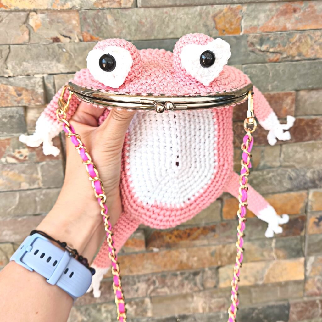 Otro ejemplo de proyecto tejido a doble hilo es este original bolso rana que te muestro en las fotos. Al tejer un bolso con doble hilo, conseguimos mayor resistencia a que se deforme, que el punto sea más grueso y vistoso o que sea de mayor tamaño.