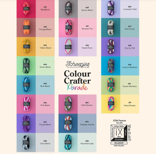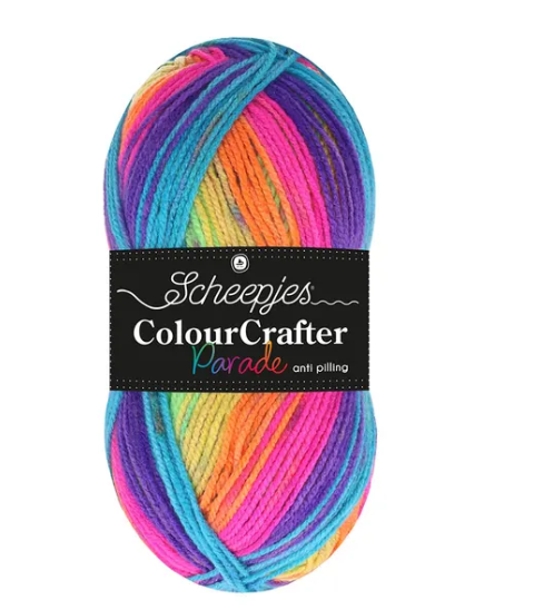 Scheepjes Colour Crafter Parade tiene una textura suave y agradable. Está fabricado con acrílico de alta calidad resistente al pilling (antibolas).
